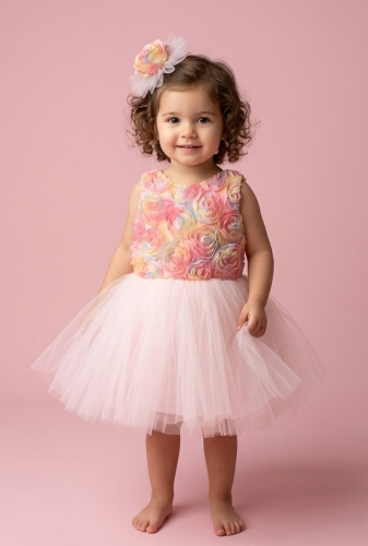 Billur Pembe Gül Beden Kolsuz Çocuk Elbisesi ve Tokası