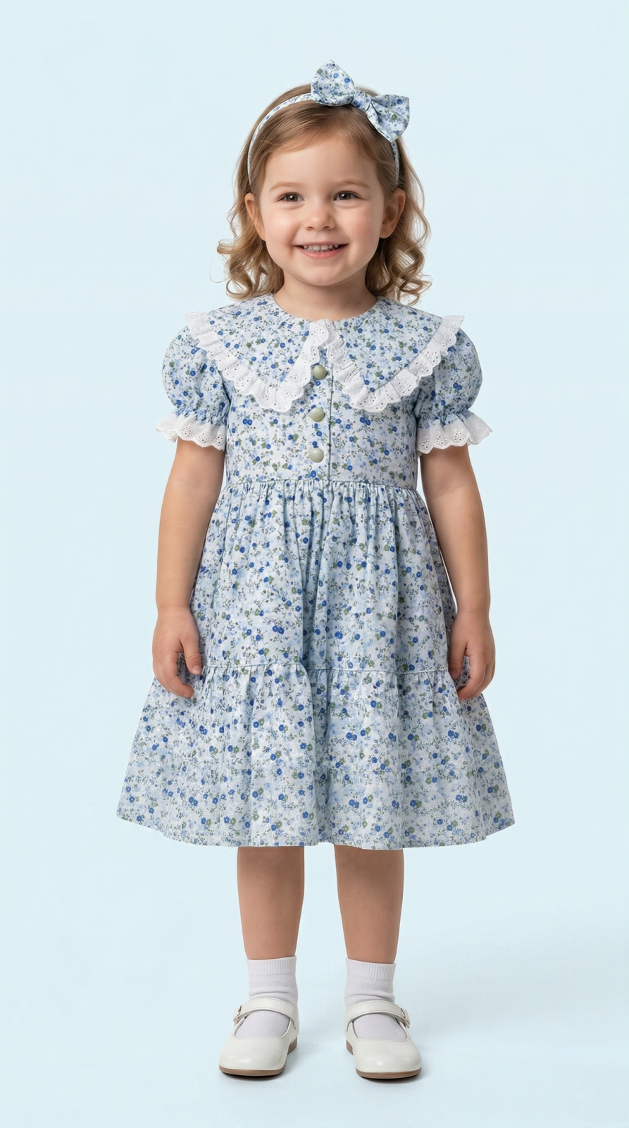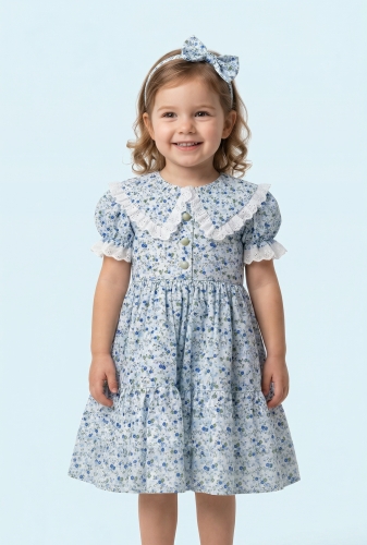 Melisa Mavi Beyaz Büyük Yaka Kız Çocuk Elbisesi ve Tokası