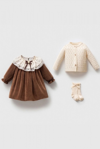 NipperLand 9304NY KIZ 3-6 AY TRİKO HIRKA KADİFE ELBİSE TAKIM KREM KAHVE